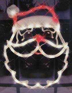 Lighted Santa Face Christmas Decoration Item #95013 Dimensions: 18"H x 13"W x 0.75"D Material(s): durable high impact plastic Features: Illuminated by 43 super bright red and white mini lights Clear frame allows for double-sided use Fully assembled decoration comes in 1 piece 60 inch white cord has 1 plug with end connector allowing you to stack multiple sets of lighted decorations together (not to exceed 210 watts) Comes with a suction cup for hanging, spare replacement bulbs and an extra fuse UL listed for indoor/outdoor use 120 volts, 60 hertz, 0.14 amps, 16.