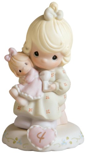 Precious Moments little girl holding a doll and a heart on the base has a number 4 on it figurine.Infused with honest emotion it shares a message that speaks straight to the heart.Each Piece Is Porcelain Bisque; Hand Sculpted and Hand Painted.Indoor Use Only; Should Be Dusted Occasionally.Packaged in a box made from recycled materials..